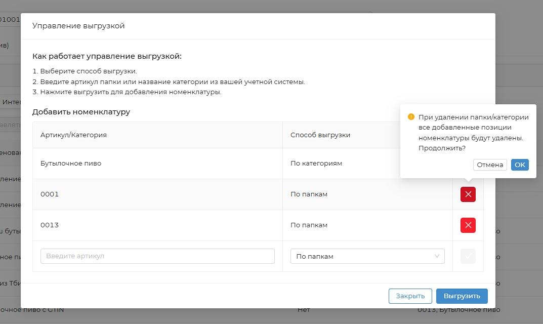 При необходимости их можно удалить: нажмите на красную кнопку и подтвердите удаление всей выгруженной в артикуле/категории номенклатуры.