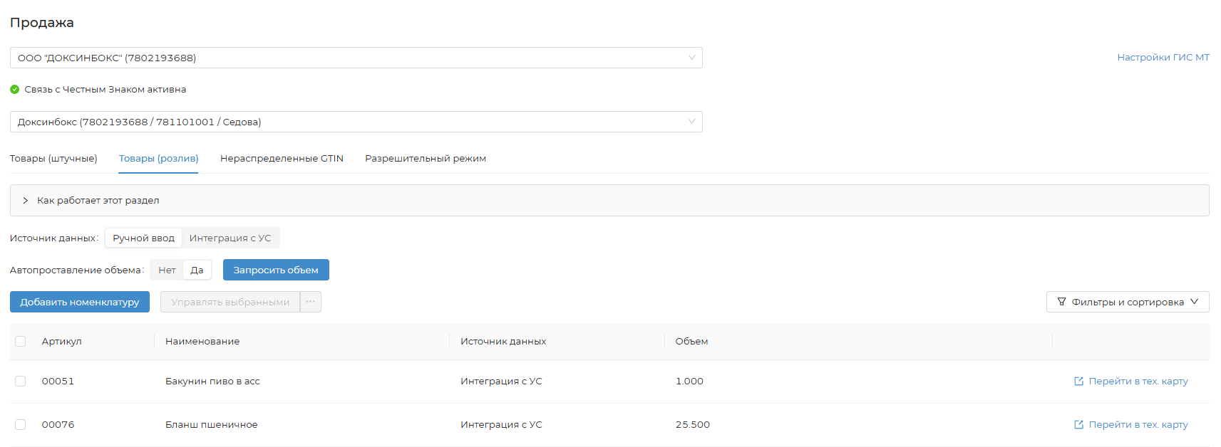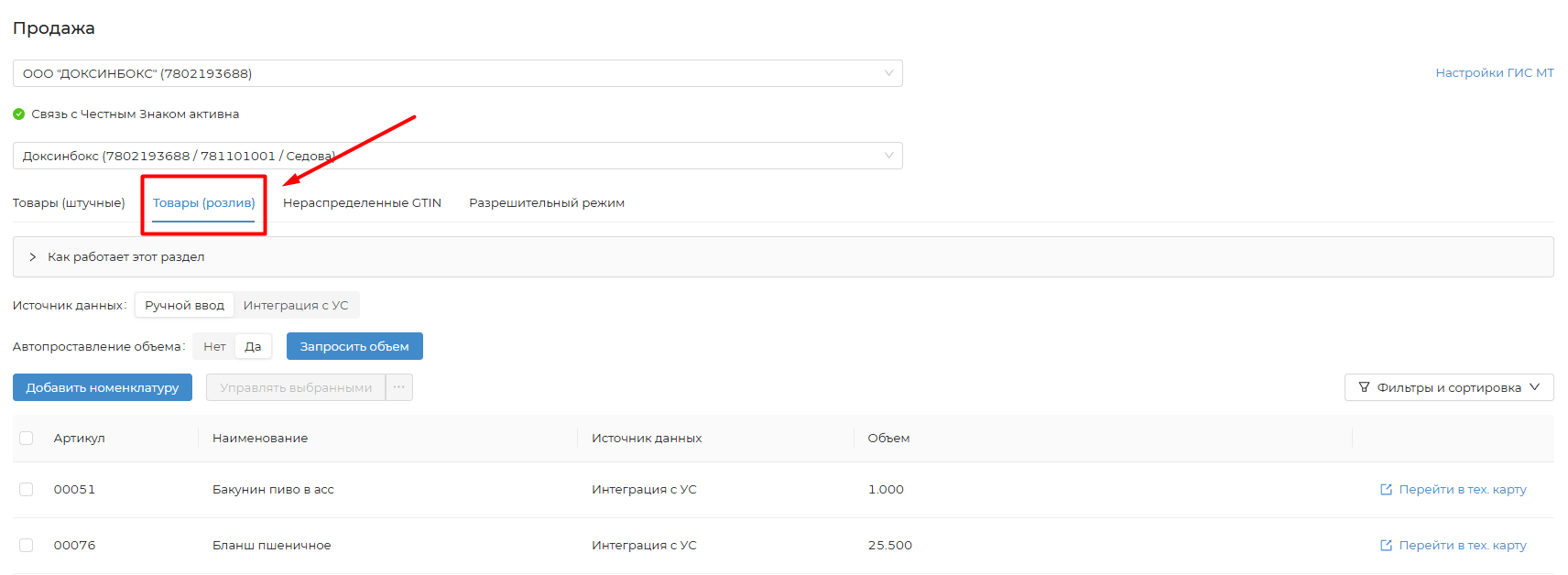 "Данные" → "Маркировка в честном знаке" →"Продажа" → "Товары (розлив)"