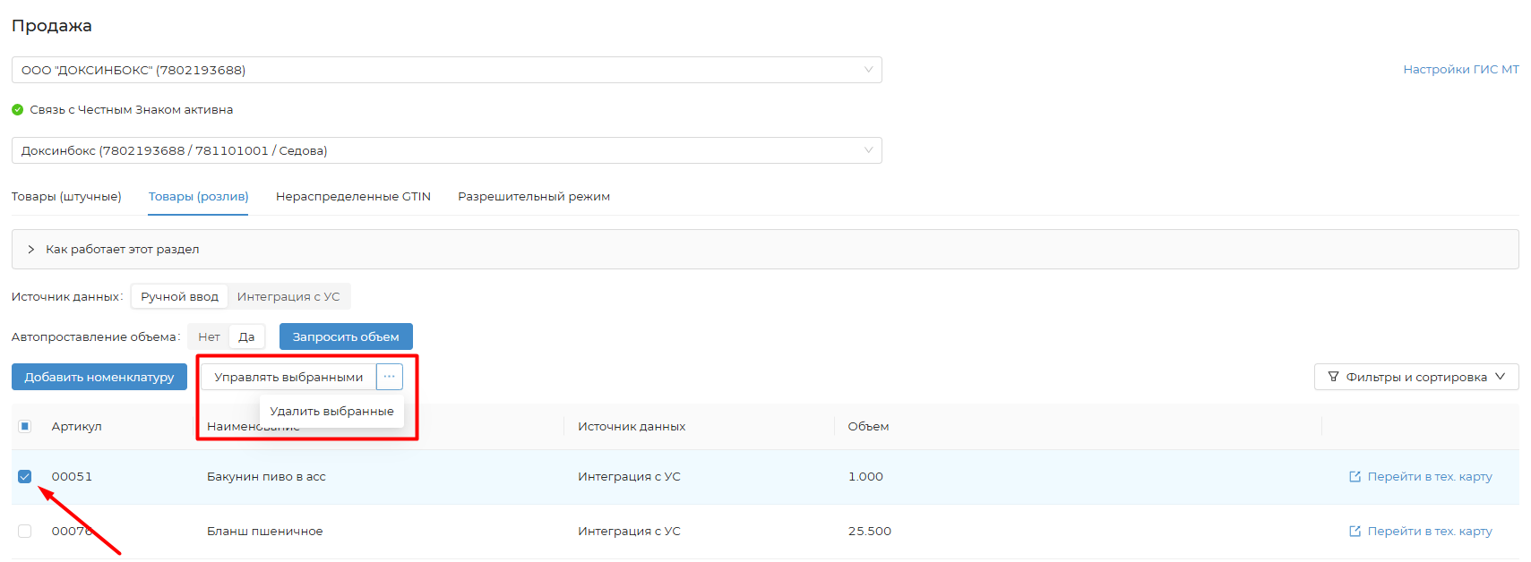 2. Выберите юридическое лицо, нажав на поле "Выберите кабинет в Честном Знаке" → выберите точку продаж в поле "Торговая точка" выберете вкладку "Товары (розлив)".