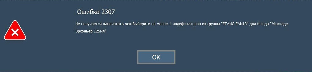 Ошибка 2307: Не получается напечатать чек:Выберите не менее 1 модификаторов из группы "ЕГАИС EAN13" для блюда *