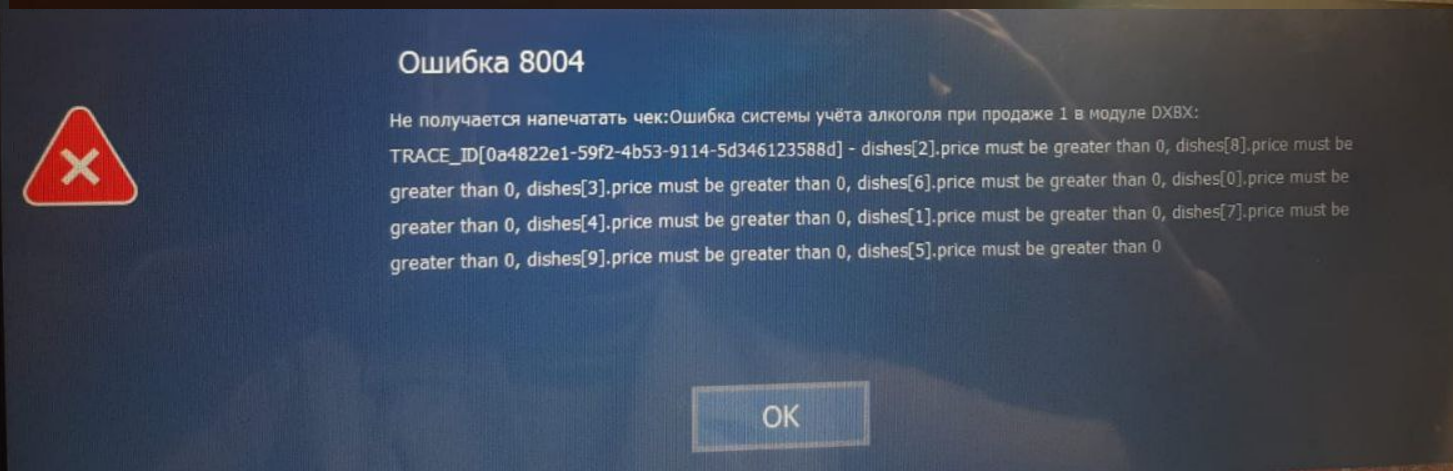 Не получается напечатать чек:Ошибка системы учёта алкоголя при продаже -1 в модуле DXBX:TRACE_ID[] - dishes[0].price must be greater than 0