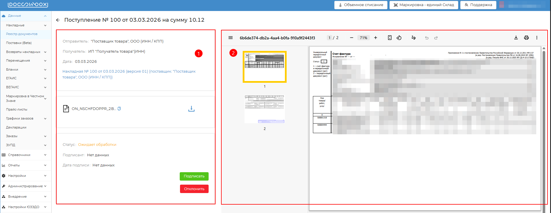 - При нажатии на кнопку документ будет отклонен с помощью электронной подписи и данная информация будет направлена контрагенту-отправителю