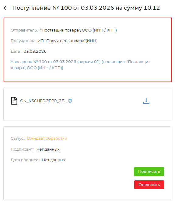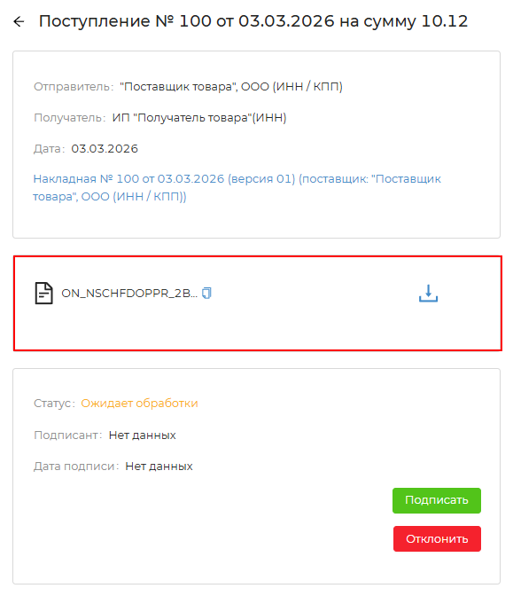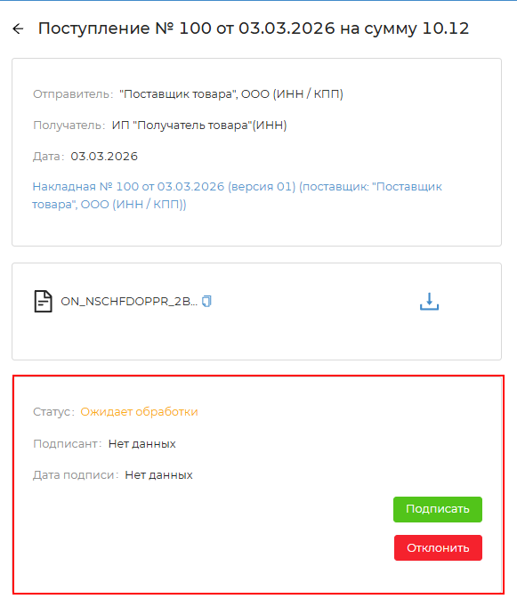 - При нажатии на кнопку документ будет подписан с помощью электронной подписи и данная информация будет направлена контрагенту-отправителю