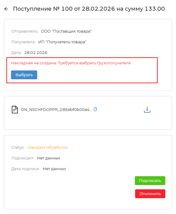 - Накладная - ссылка на накладную для работы с приемкой, сопоставлением и выгрузкой в УС.