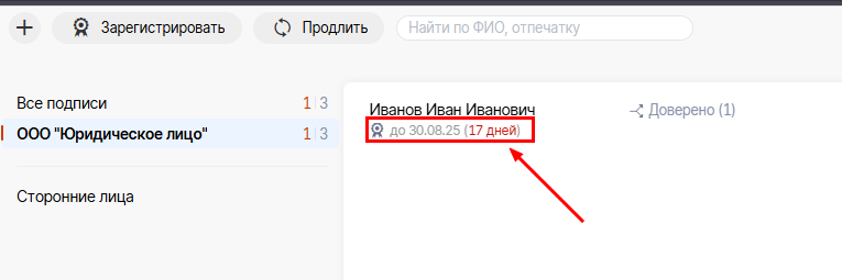 6. Вы сразу можете увидеть дату окончания действия ЭЦП и кол-во дней, оставшихся до конца срока.