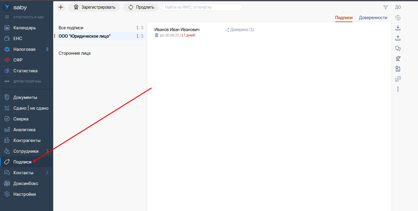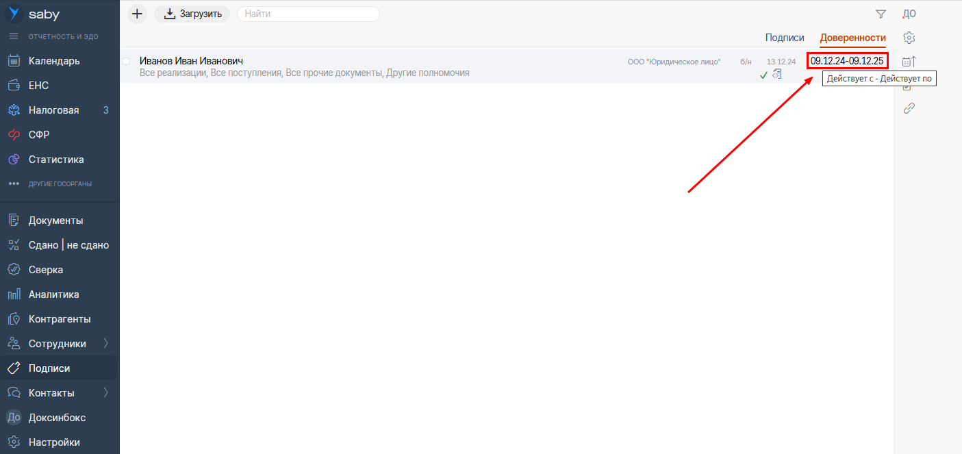 - Перейти в раздел "Доверенности" в боковом меню слева