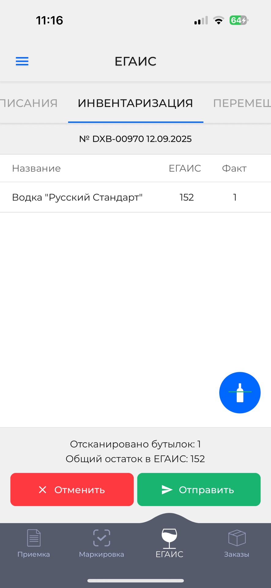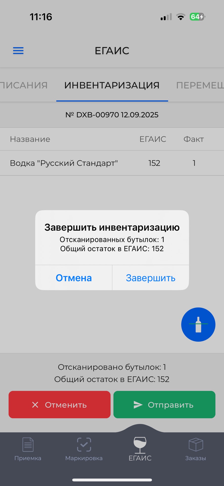 3. После сканирования в окне сформируется список всех отсканированных бутылок. После окончания сканирования нажмите на кнопку «Отправить» в нижней части экрана, и подтвердите завершение инвентаризацией кнопкой «Завершить»