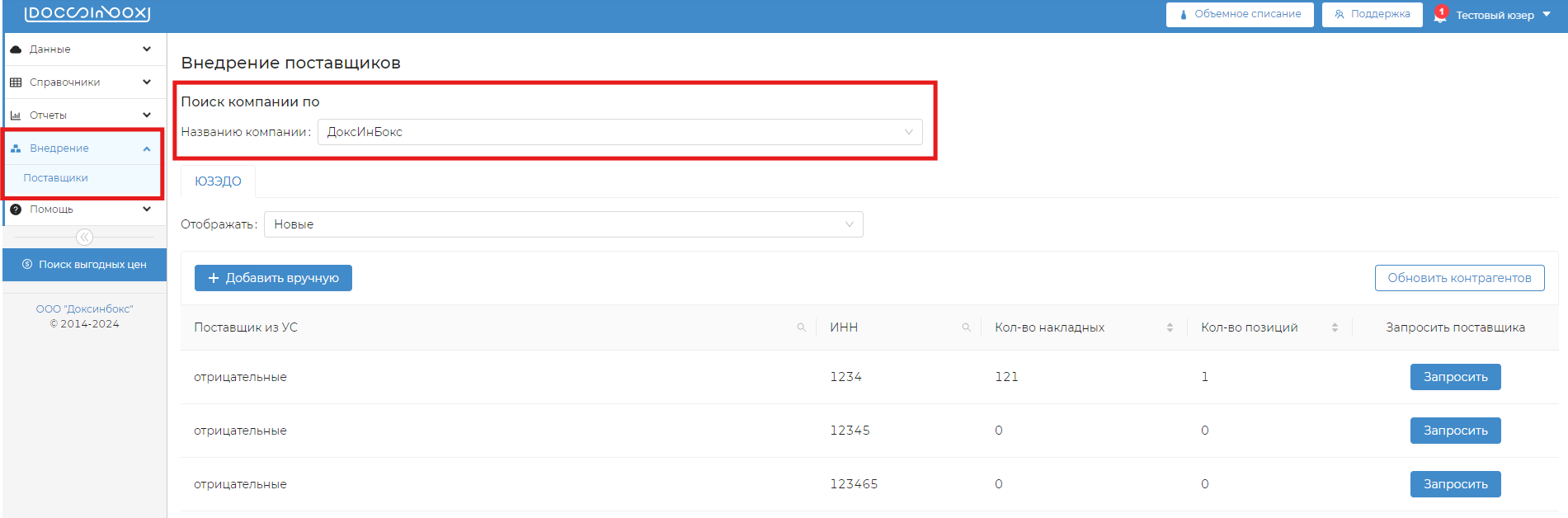 Все действия выполняются на странице в разделе «Внедрение» во вкладке «Поставщики».