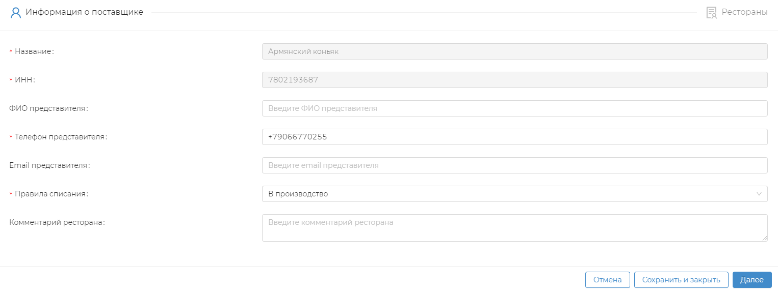 Если вы добавляете продуктового поставщика, в строке «Правила списания» можно выставить любое правило. - После того, как все необходимое будет заполнено нажмите кнопку «Далее».