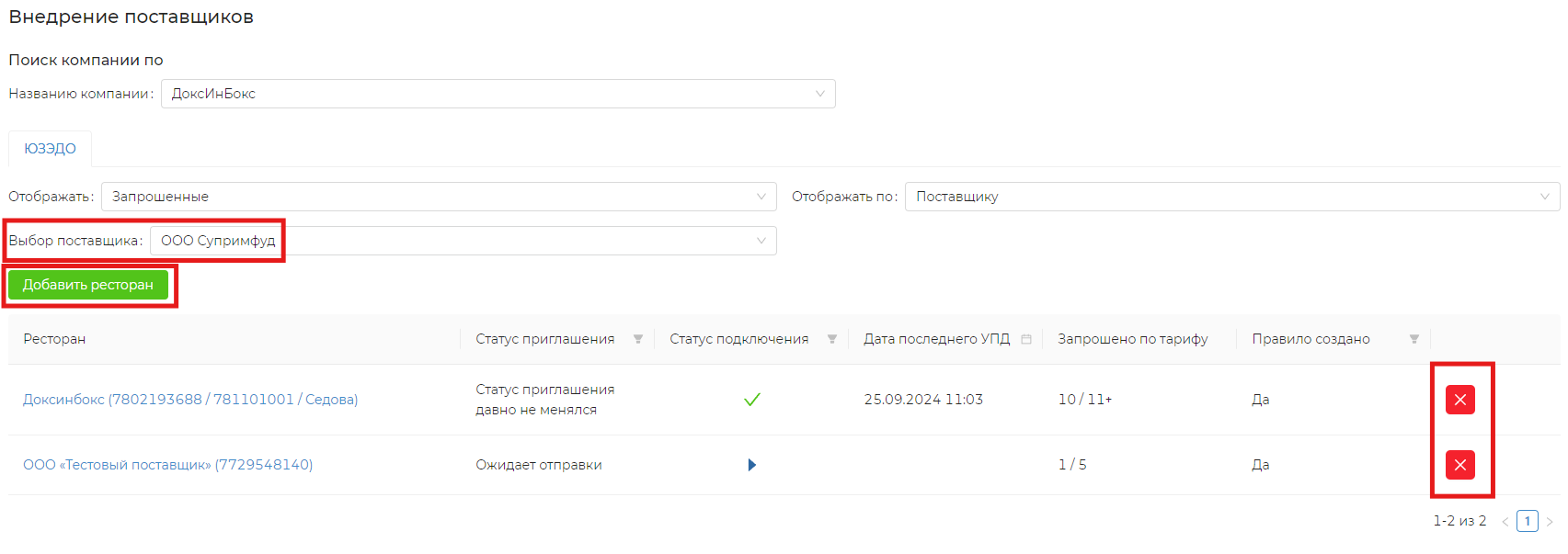 По кнопке «Добавить ресторан» можно запросить подключение поставщика на новый ресторанНажав на красную кнопку с крестиком можно удалить ресторан для выбранного поставщика, если он с этим поставщиком больше не работает.