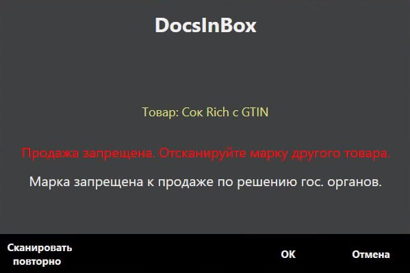 Продажа запрещена. Отскнируйте марку другого товара. Марка запрещена к продаже по решению гос. органов