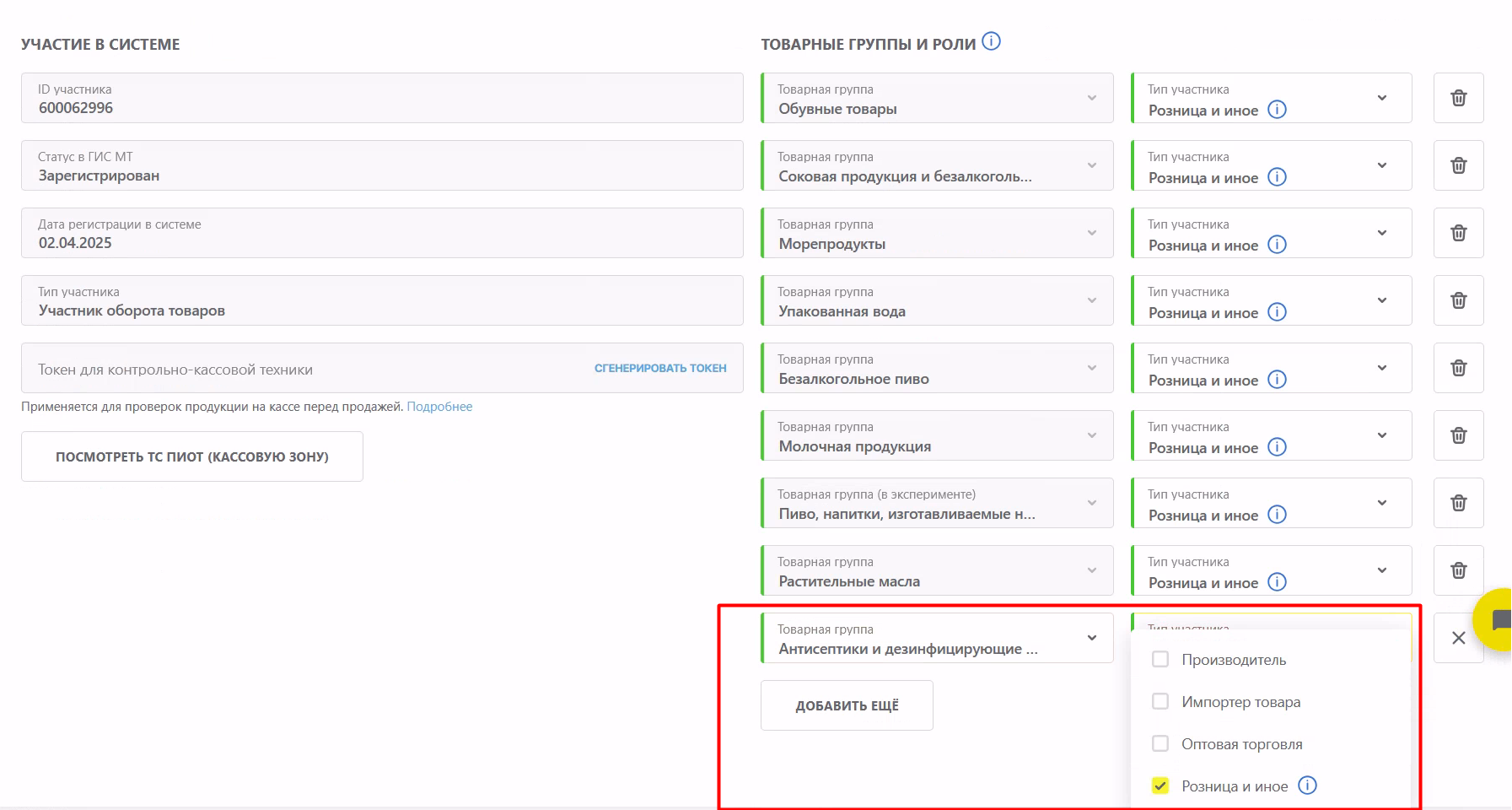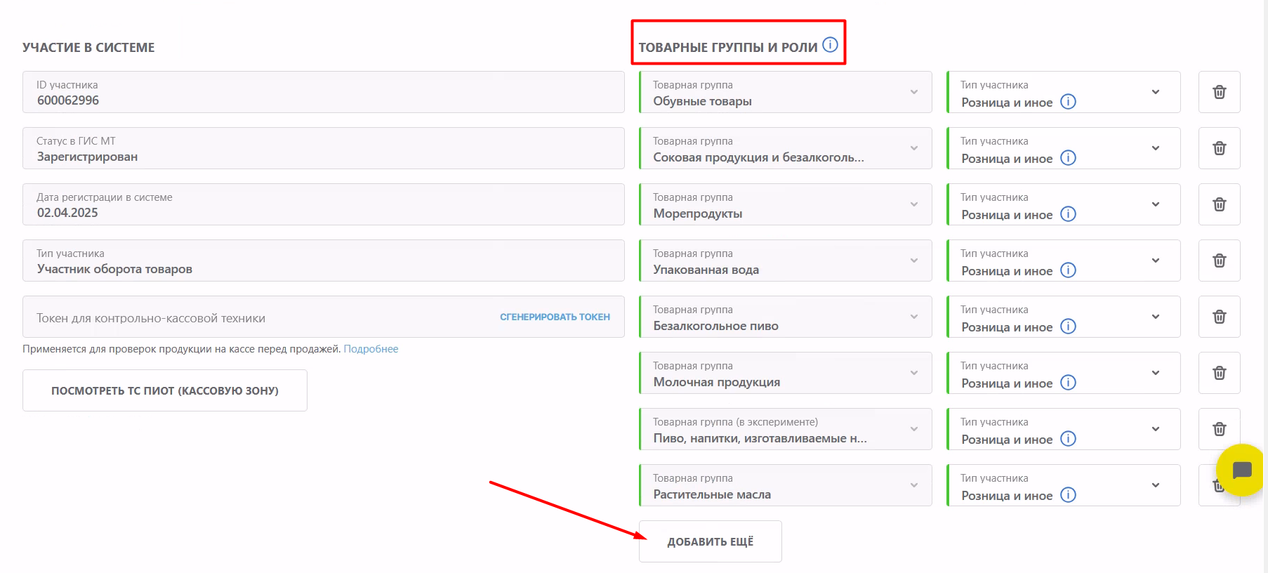 2. В блоке с ролями / товарными группами нажмите «Добавить еще».